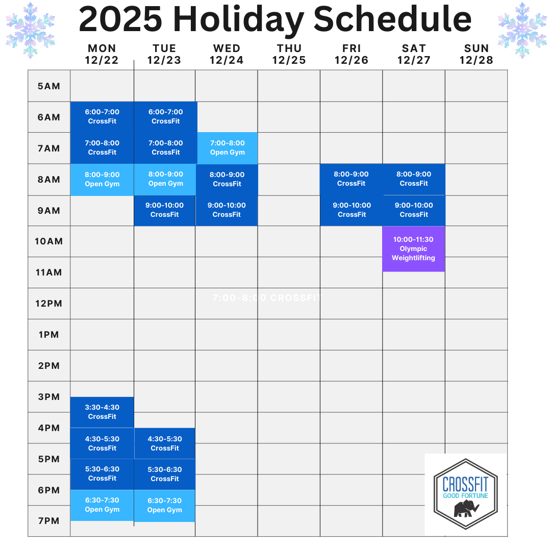 We’ve got a full month of fitness, fun, and celebration lined up at CrossFit Good Fortune! Here’s everything happening in December so you can plan ahead, reserve your classes, and invite your friends and family to join in.